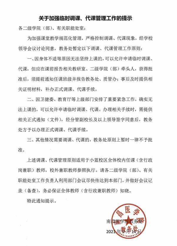 转发教务处《关于加强临时调课、代课管理工作的提示》