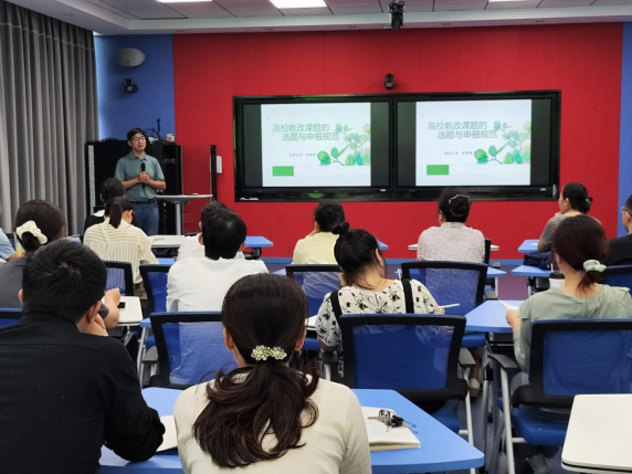 随后,南昌大学教育发展研究院教育学博士、博士生导师黄厚明教授作为特邀嘉宾,为与会者带来了题为《高校教改课题的选题与申报规范》的专题讲座。黄教授从教改课题的选题原则、研究热点分析、申报材料准备及评审要点等多个维度进行了深入剖析,并结合自身丰富的科研经验,分享了多个成功申报案例,为教师们提供了宝贵的参考和借鉴。他强调,选题应紧密结合国家教育政策导向和学科发展趋势,注重创新性和实用性,同时遵循严谨的科研规范和伦理要求。黄教授的讲解深入浅出,赢得了在场教师的阵阵掌声。