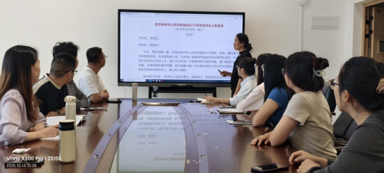 会上,学习氛围热烈。在周洁的带领下,全体教师党员研读习近平总书记在庆祝中华人民共和国成立76周年招待会上的讲话原文,并结合教育领域发展实际展开交流讨论。吴饶平围绕“以人民为中心”理念,结合医学教育“培养服务人民健康的医务人才”这一核心目标,分享了在《生理学》课程融入“人民至上、生命至上”教育理念的思路。